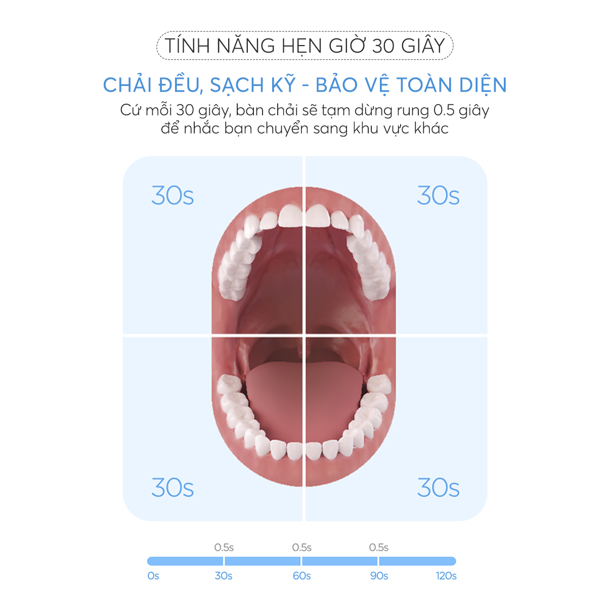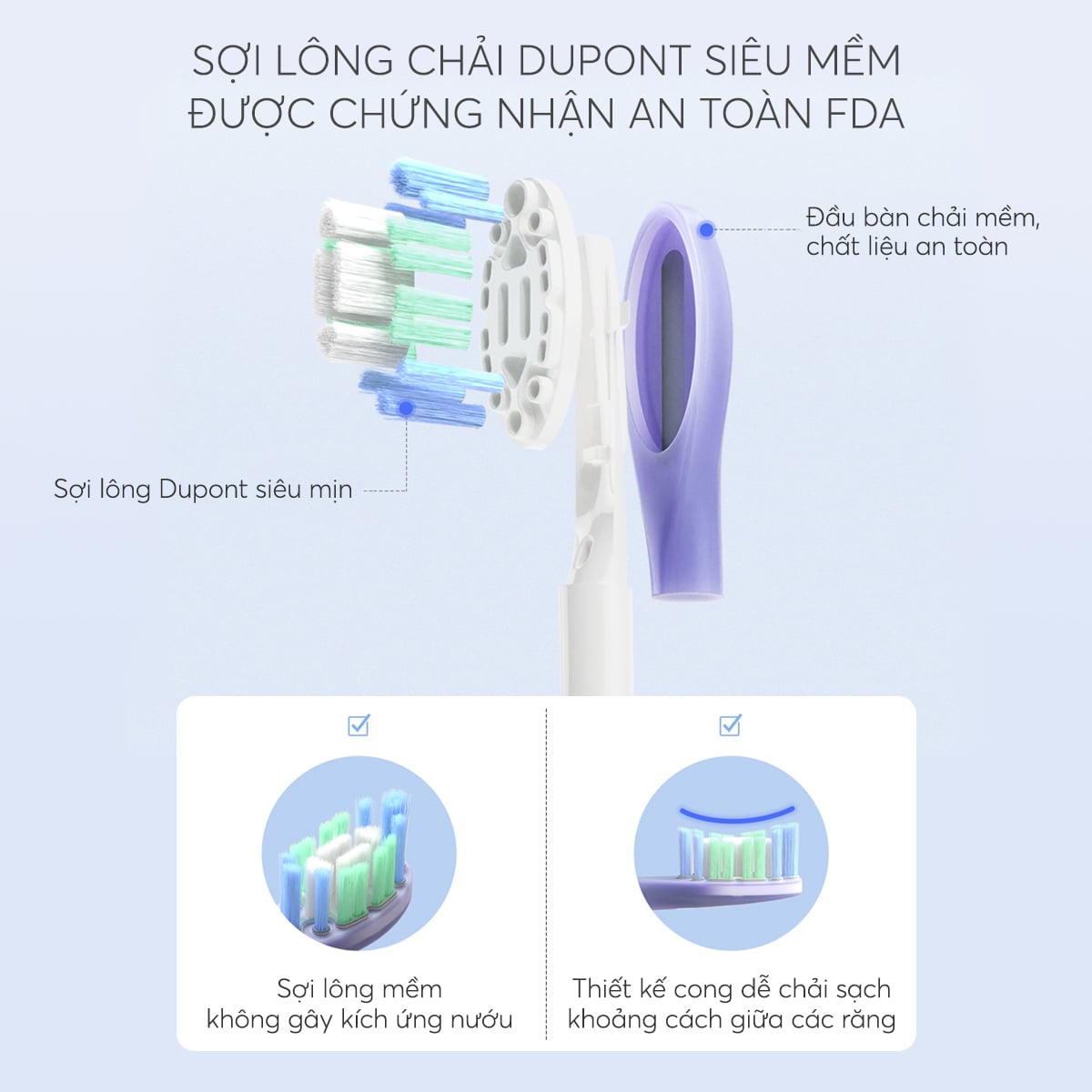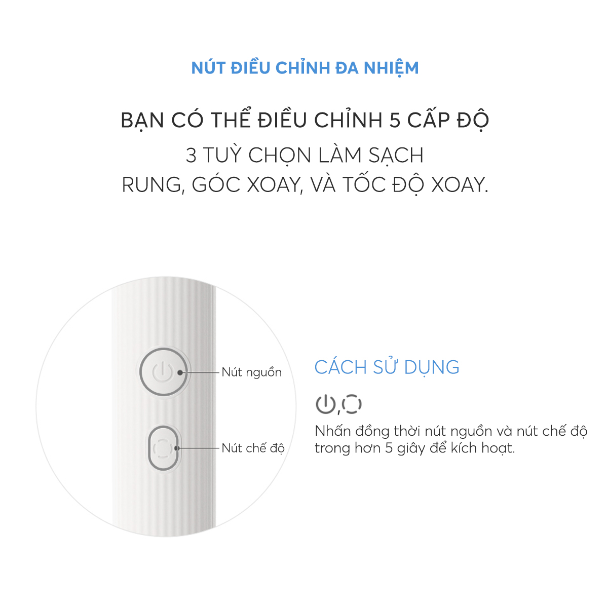 Đầu bàn chải dao động góc rộng 60°, dễ dàng tiếp cận kẽ răng và viền nướu, loại bỏ mảng bám hiệu quả hơn.
