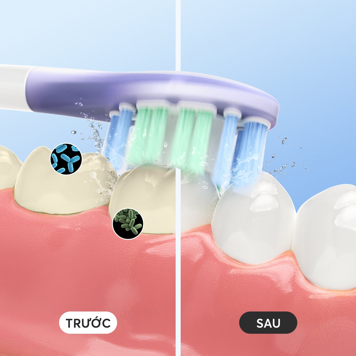 Bàn chải điện thế hệ mới với dao động ngang chủ động kết hợp rung sóng âm, làm sạch chuẩn nha khoa – sạch sâu nhưng vẫn êm dịu cho nướu.