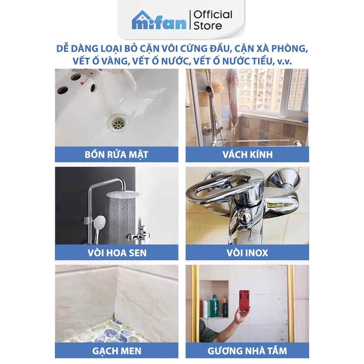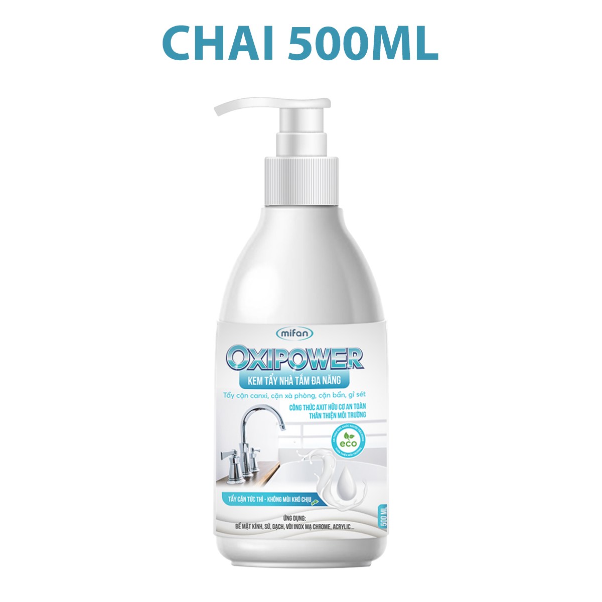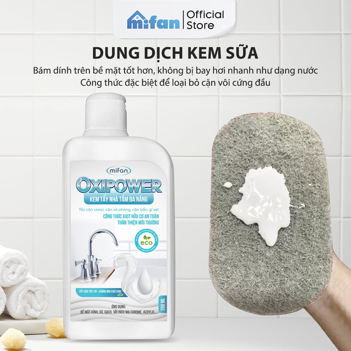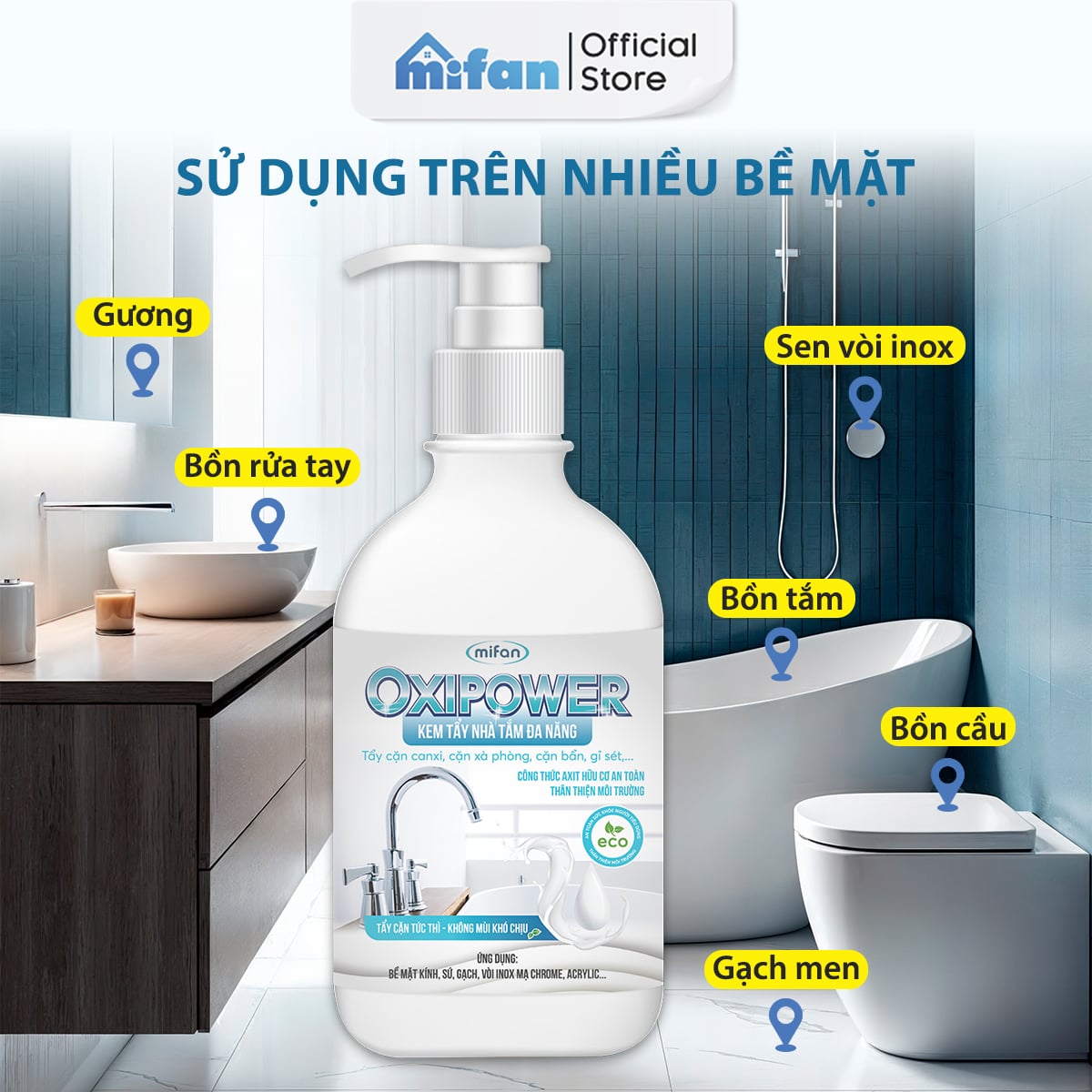 Kem Tẩy Nhà Tắm Đa Năng Mifan Oxipower là giải pháp vệ sinh toàn diện cho phòng tắm hiện đại, giúp làm sạch hiệu quả cặn vôi, cặn canxi, vết ố vàng và mảng bám cứng đầu chỉ với 1 sản phẩm duy nhất.