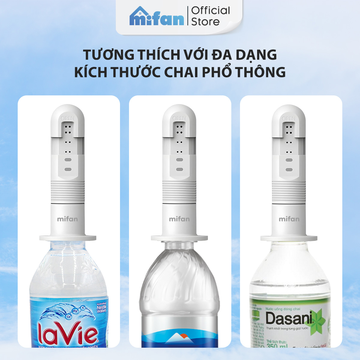 Tương thích: Cổ chai từ 21–25mm (Lavie, Aquafina, Dasani, Evian…)